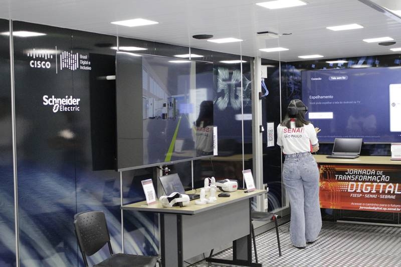 Como bônus, a escola móvel de conectividade 5G do Senai esteve disponível para visitação. O ambiente imersivo conta com cinco cases que as tecnologias 5G e Wi-fi 6 podem proporcionar. Logo na entrada, foi posicionada uma grande tela com reconhecimento facial e de objetos, que pode ser utilizada para diferentes aplicações pelas empresas. Na sequência, os visitantes se deparavam com um protótipo touch de itens virtualizados, que torna possível a sensação do tato. A próxima atração era uma máquina de sorvete com um dispositivo IoT, que permite a captação de dados da produção e os disponibiliza online para que sejam analisados e conduzam à padronização de processos.